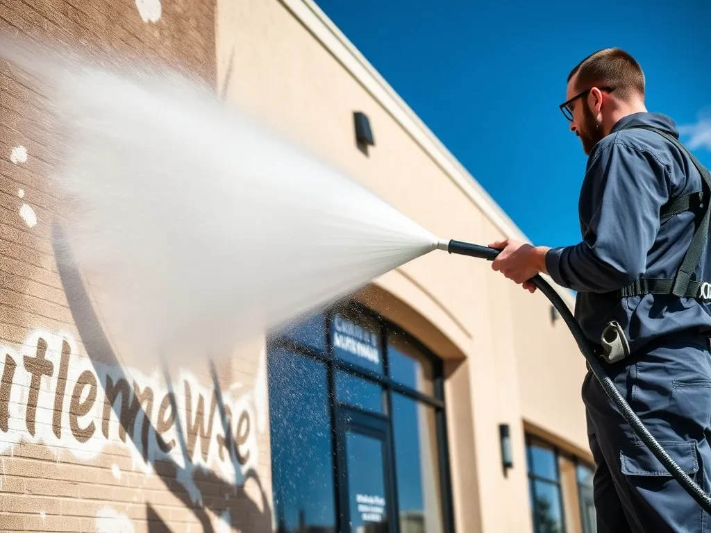 Power washed a commercial building in North Dallas TX, removing dirt, mold, and graffiti for a fresh, professional look.